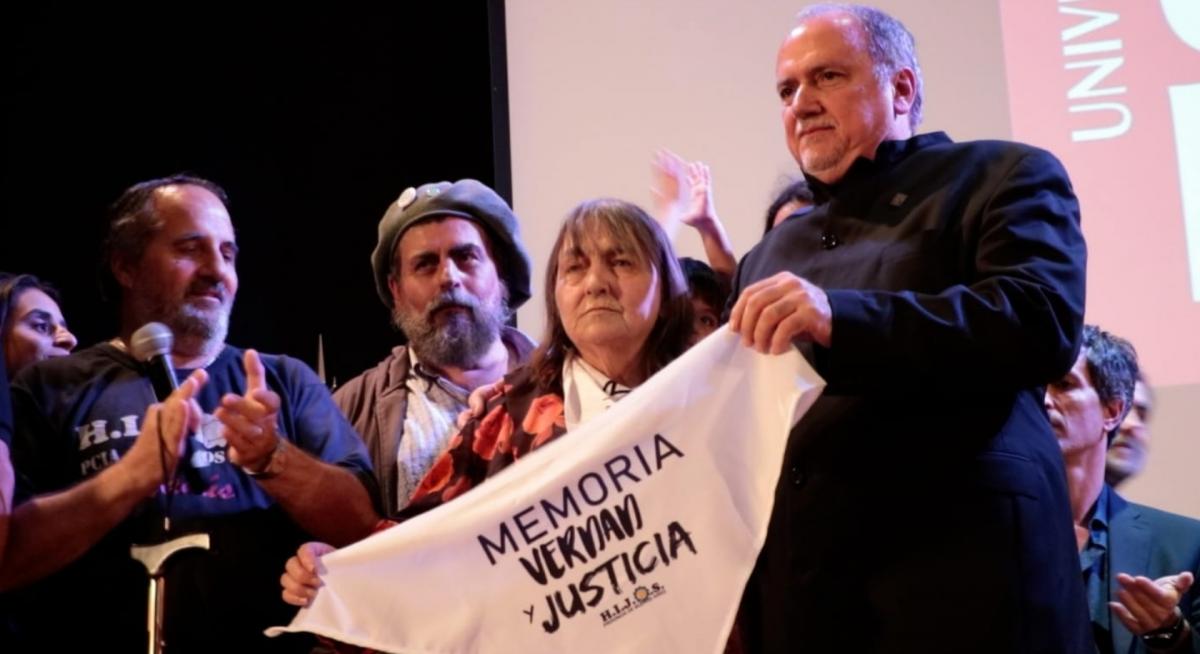 “Un momento emotivo de la ceremonia sucedió cuando la agrupación de derechos humanos H.I.J.O.S de Lanús le obsequió a Bozzani un pañuelo con el logo de la organización por todo sus compromisos con la memoria, por la verdad y justicia”, señalaron voceros universitarios.